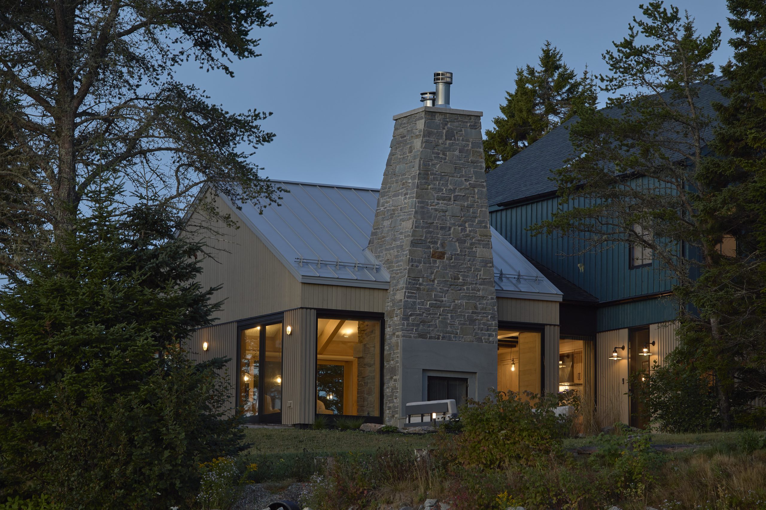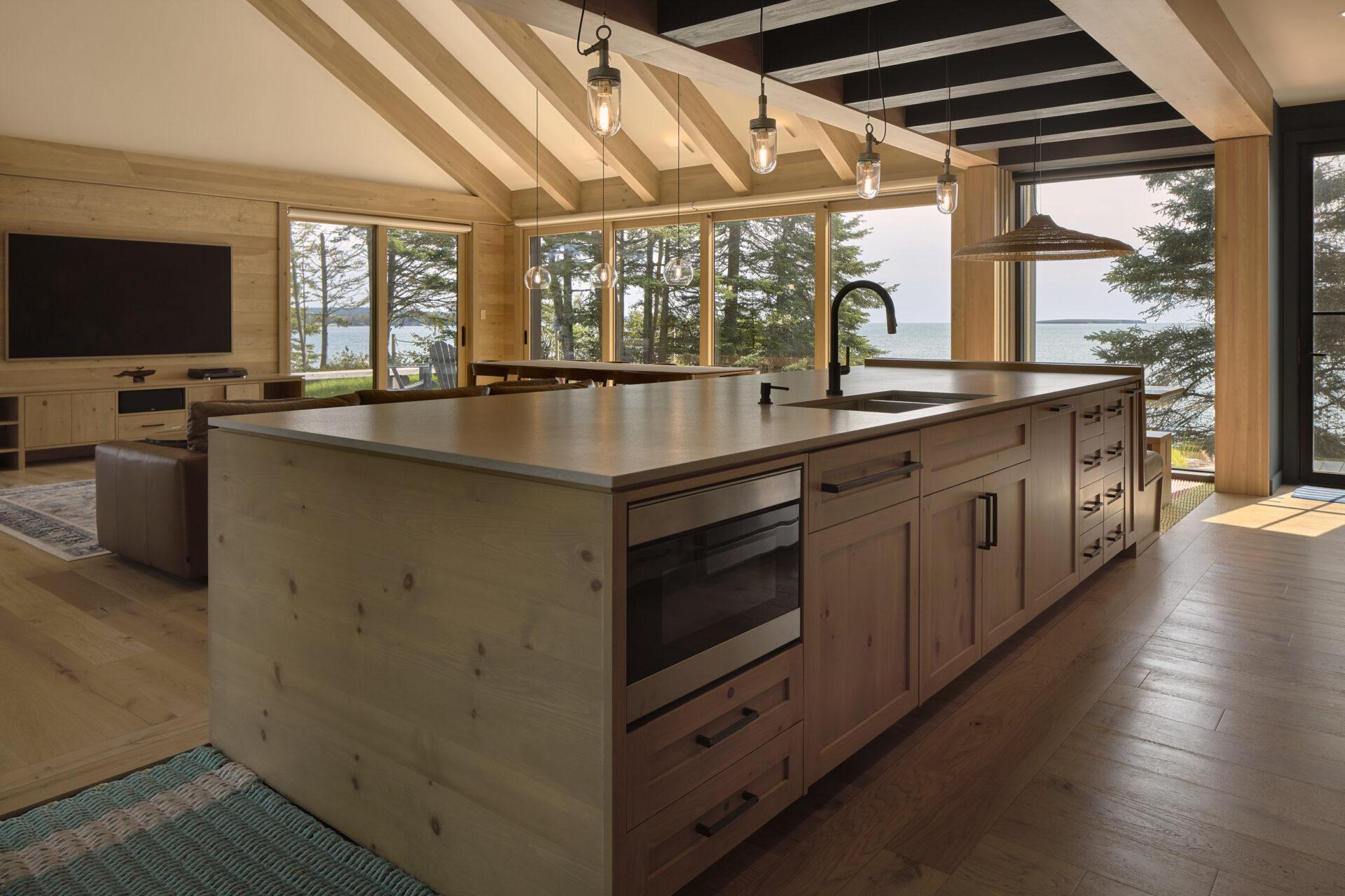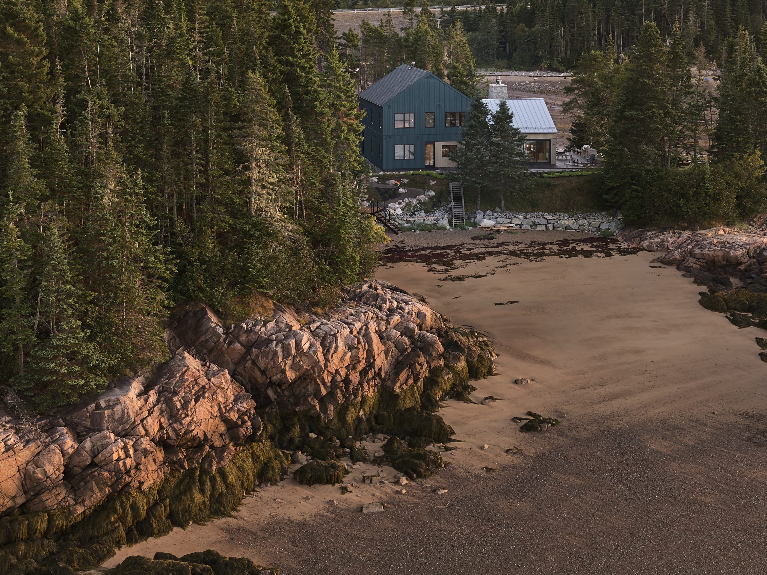 Set on a rocky outcropping just steps from the water, this coastal home has stunning water views from almost every room in the house. Using local wood and stone this house exudes comfort and warmth.